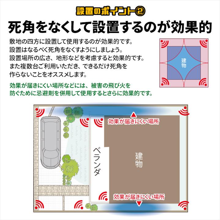 ●敷地の四方に設置して使用するのが効果的です。