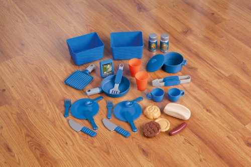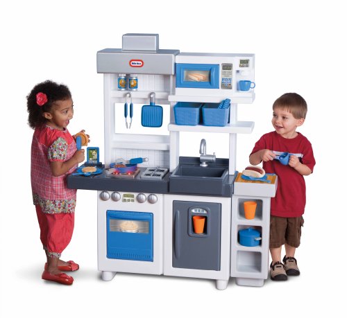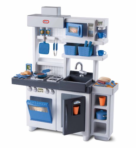 - Feature : Extend countered space; Opening doors for oven, fridge and microwave / Plenty of storage and shelves for accessories; Cabinet opens to reveal extra storage shelves / Pegs for kitchen utensil storage; Clicking knobs / Electronic cooking sounds on stove top and sink; Cappuccino maker for modern play / Includes approx. 38 total pieces; Made in USA