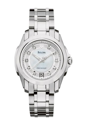 -. Feature : Women's Precisionist bracelet watch mother-of-pearl dial / Domed mineral crystal with silver metalized rim; Beveled dauphine hands with flat tip and tail, luminous filled middle / Stainless steel case and bracelet / 10 diamonds, duet to 96D110, calendar / Water resistant to 99 feet (30 M): withstands rain and splashes of water, but not showering or submersion