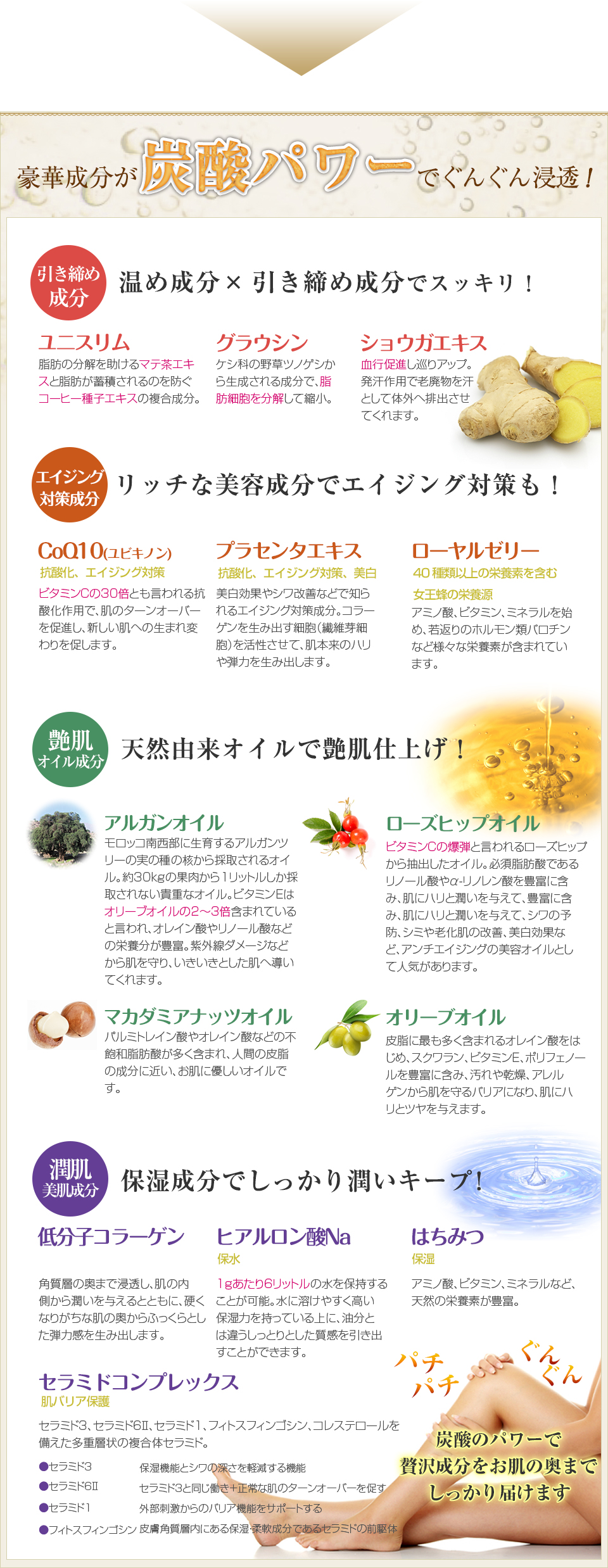 LPG、水、エタノール、シク ロペンタシロキサン、二酸化炭素、シクロヘキサシロキサン、グリセリン、ハチミツ、マテチャ葉エキス、コーヒー種子エキス、カプリリルグリコール、ローヤ ルゼリーエキス、プラセンタエキス、ショウガ根エキス、ヒアルロン酸Na、加水分解コラーゲン、ホホバ種子油、ローズヒップ油、オリーブ油、マカデミア種 子油、ラウロイルグルタミン酸ジ(フィトステリル/オクチルドデシル)、セラミド3、コレステロール、セラミド6Ⅱ、フィトスフィンゴシン、ユビキノン、 セラミド1、アルガニアスピノサ核油、バニリルブチル、1,2-ヘキサンジオール、グラウシン、ヒドロキシエチルセルロース、セチルヒドロキシエチルセル ロース、カルボマー、キサンタンガム、ラウロイル乳酸Na、PEG-60アーモンド脂肪酸グリセリル、ヤシ油アルキルグルコシド、水添レシチン、ラウリン 酸ポリグリセリル-10、ポリソルベート20、BG、トコフェロール、安息香酸Na、ソルビン酸K、メチルパラベン、エチルパラベン、プロピルパラベン、 香料、タルク |