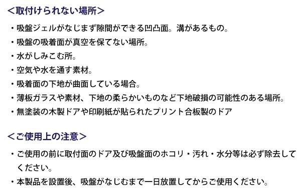 | 凸凹面対応でいろいろなドアに使用可能。密着ジェル+レバー式吸盤で固定力が強く、取付け、取り外しも簡単にすることができます。 |