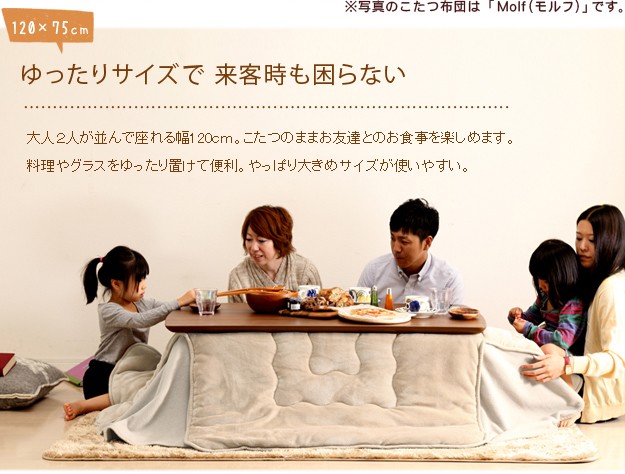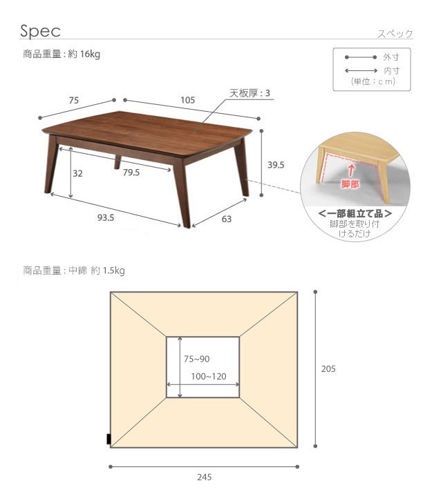 材質:[本体]天板-天然木化粧繊維板(BRウォルナット・NA楢)、脚・幕板-天然木(ラバーウッド)、[布団]表地・裏地-ポリエステル100%、中綿-ポリエステル100%
