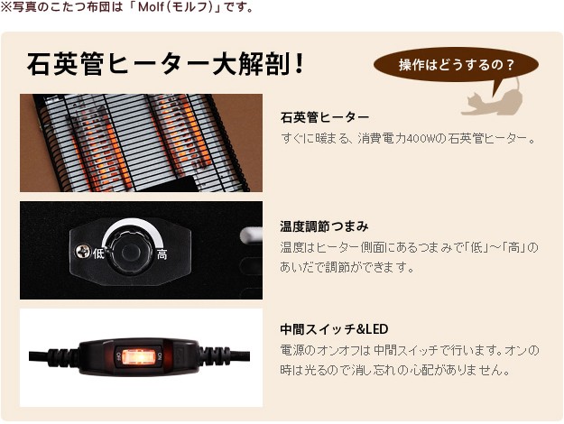 商品について:丸みを帯びた天板が優しいイメージの北欧テイストこたつ。スタイリッシュな外観でオフシーズンもテーブルとして使用できます。石英管ながら薄型のヒーターを採用で足元ゆったり広々。