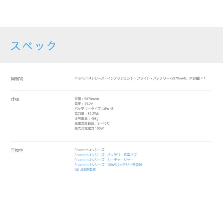 | スペック | 容量:5870mAh 電圧:15.2V バッテリータイプ: LiPo 4S 電力量:89.2Wh 正味重量:468g 充電温度範囲:5~40℃ 最大充電電力 100W |