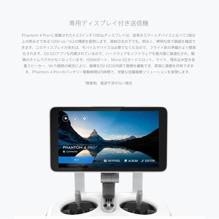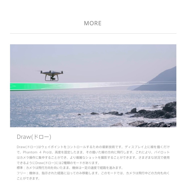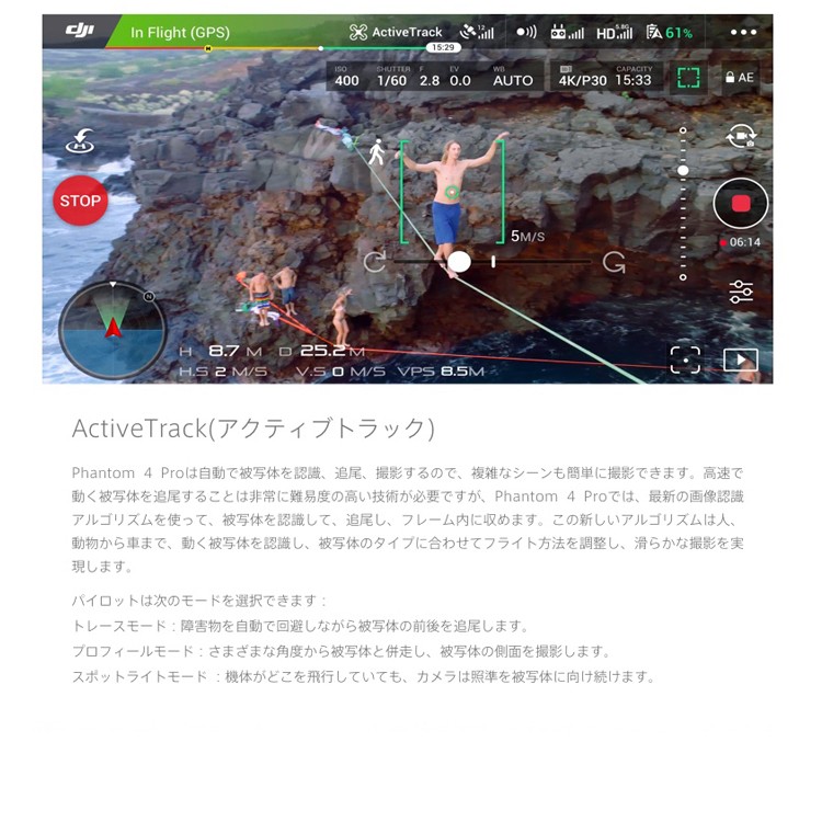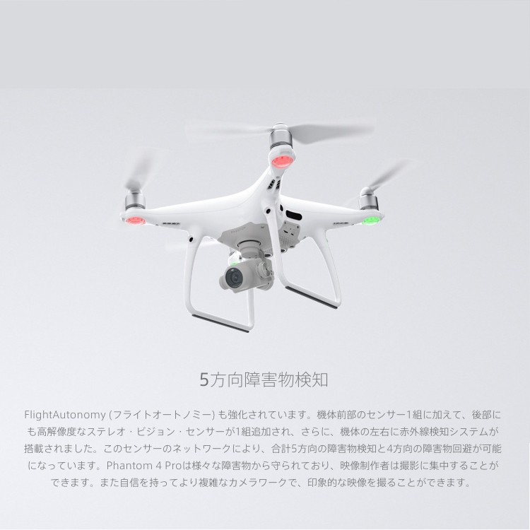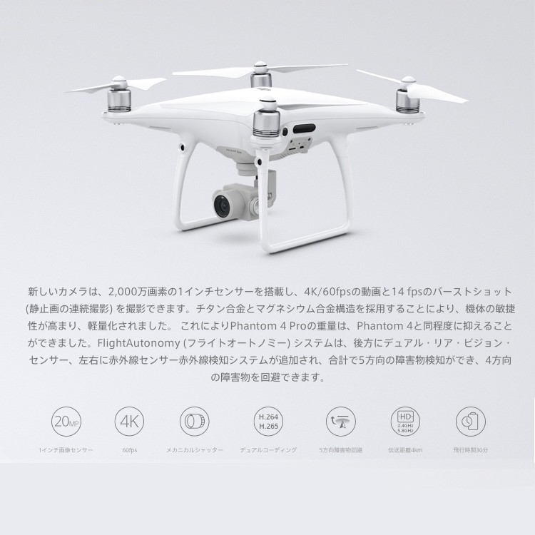 | 商品説明 | プロフェッショナルレベルの空撮には長時間の飛行が必須です。 Phantom 4 Proの最大飛行時間は30分です。 より長い時間空中にとどまり、完璧な撮影を実現します。 DJI GO 4 アプリはバッテリー残量を表示し、飛行距離などに従って、あとどのくらい飛べるのかを計算します。 バッテリー残量が離陸した場所に安全に戻ってこられないレベルに達すると、警告を発します。 また、最新のバッテリー・マネージメント・システムで過充電や過放電を防ぎます。 長期間にわたって保管される場合には、バッテリーの良好な状態を保つために放電します。 " 飛行時間30分 バッテリーステータスをDJI GO アプリで確認 自己放電保護機能 過充電/過放電保護機能" ■DJI Phantom 4とは... 革新的な素材と向上した機動力 新たにデザインされたPhantom 4のマグネシウムボディは、 軽量化しながらも剛性が高まり、振動を最小限に抑えることができます。 重心を機体の中心部まで引き上げることで、機動力、 安定性、操縦精度がさらに向上しました。 |
