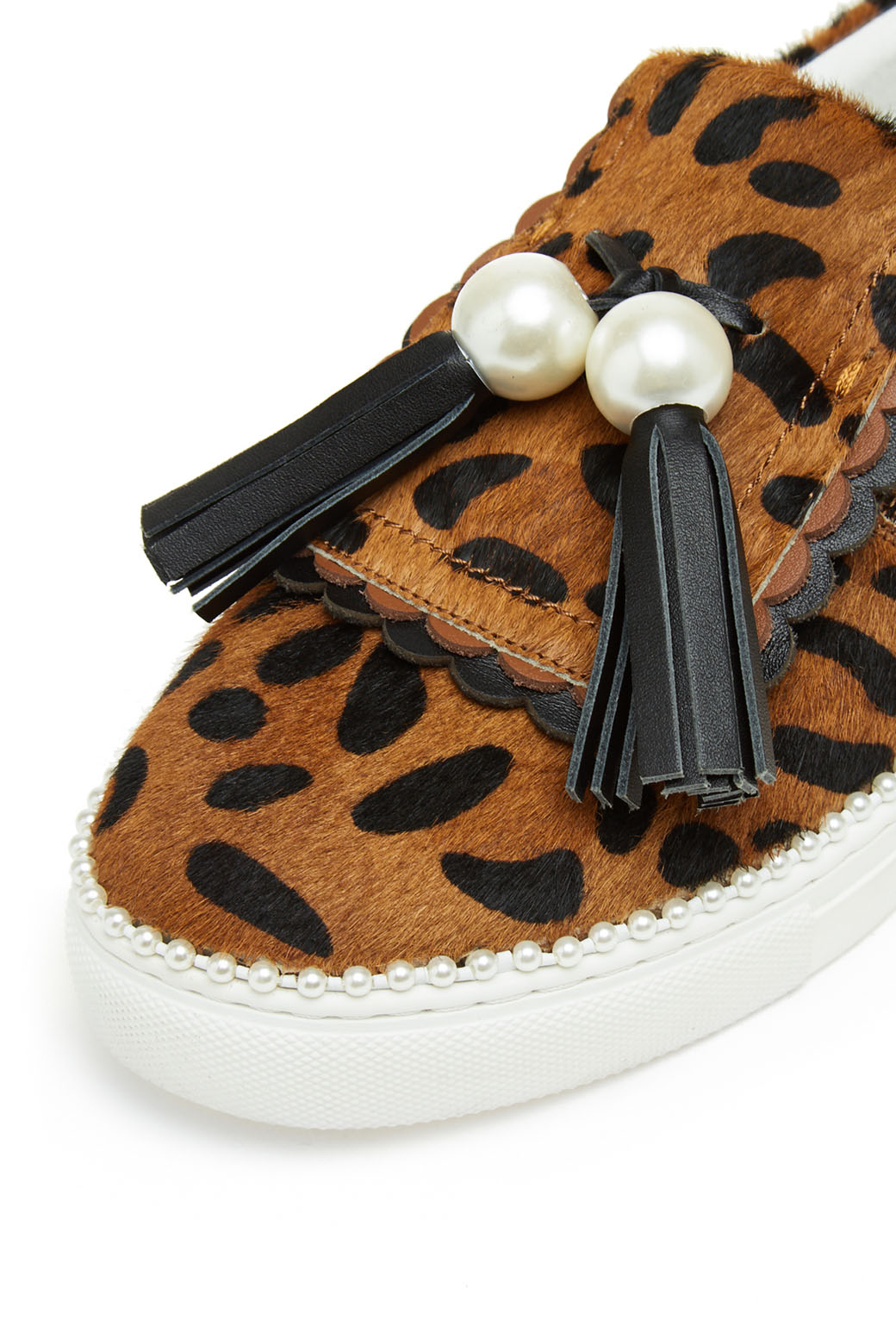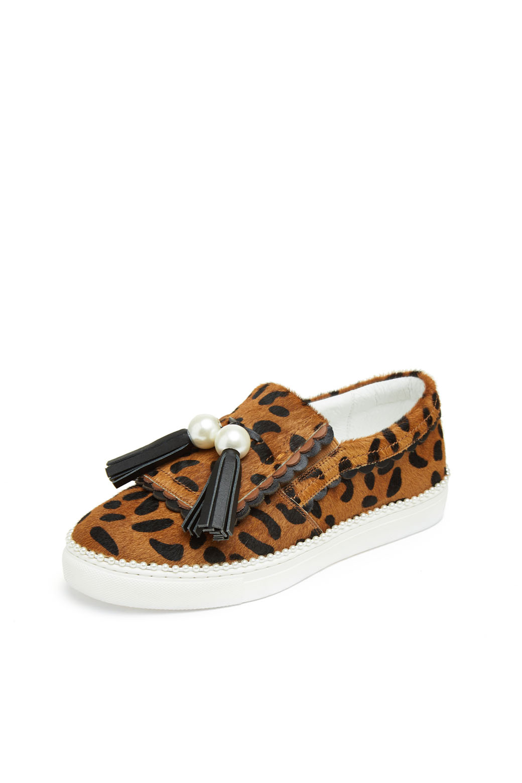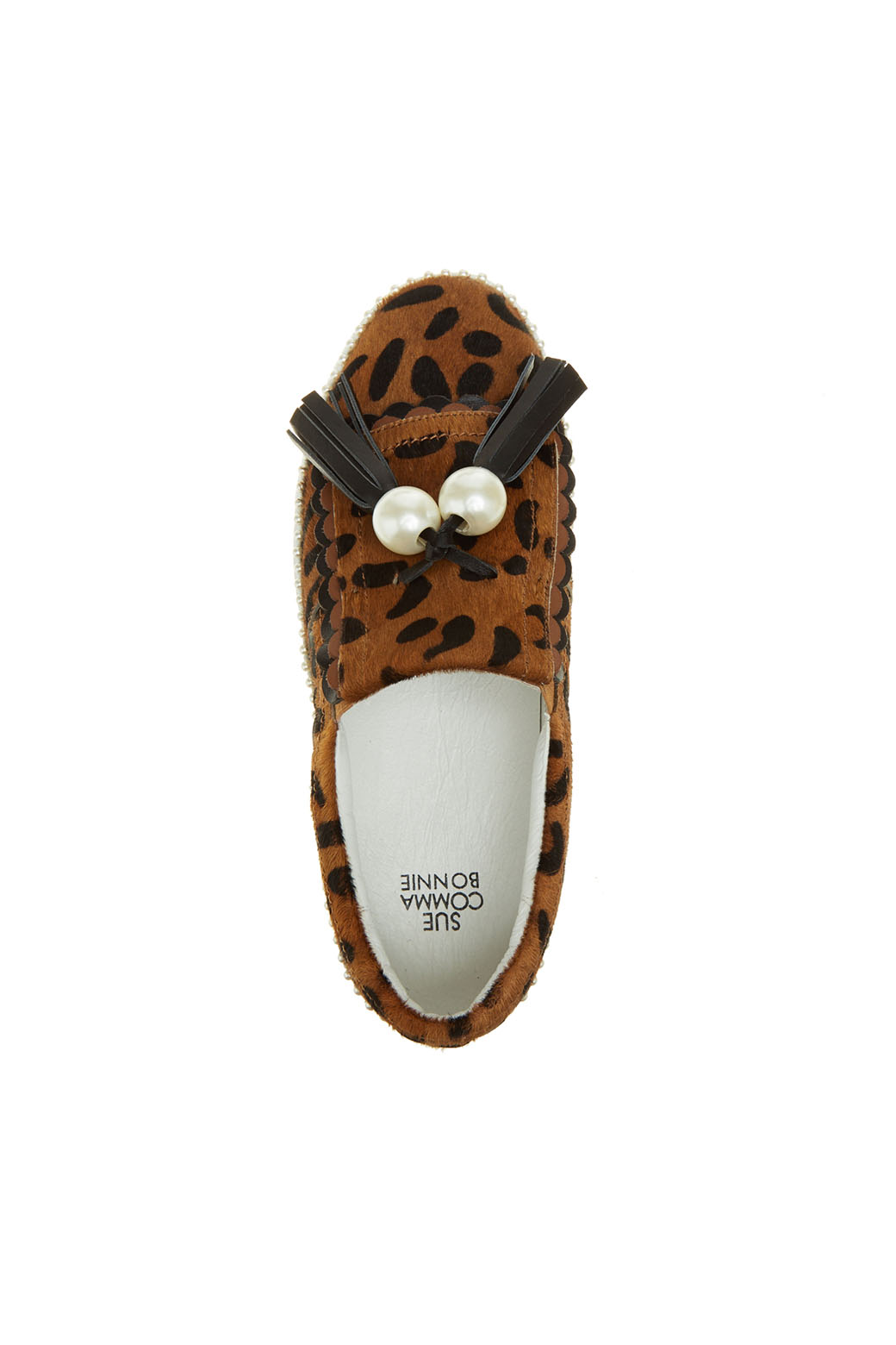 - 슈콤마보니만의 개발 몰드를 사용한 귀엽고 여성스러운 테슬 슬립온.- 커다란 진주 장식과 테슬, 물결 모양의 디테일이 포인트.- 이번 시즌 유행 패턴인 레오파드 패턴으로 세련된 외관.- 웰트부분 진주 장식으로 러블리하며 슈콤마보니만의 포인트가 들어간 슬립온 아이템.