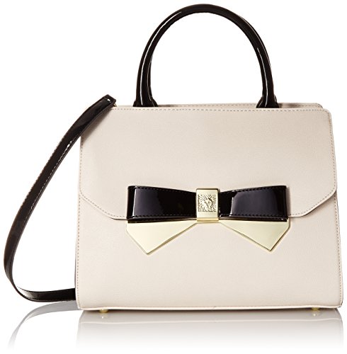 Structured two-tone handbag featuring glossy and metallic bow with logo-engraved center Dual top handles with removable/adjustable cross-body strap Item model num : Lust Worthysatchel