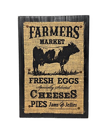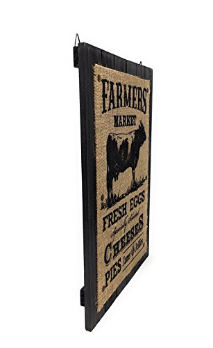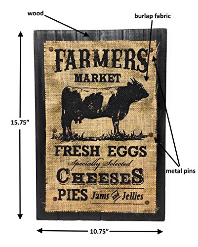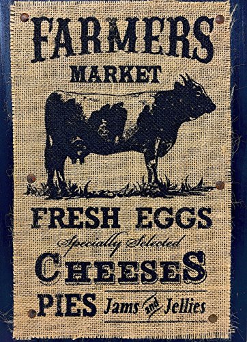 - FARMHOUSE COUNTRY STYLE KITCHEN: Farmers Market inspired “Fresh Eggs Specialty Selected Cheeses Pies Jams and Jellies” with and image of a Cow etched on the burlap fabric.