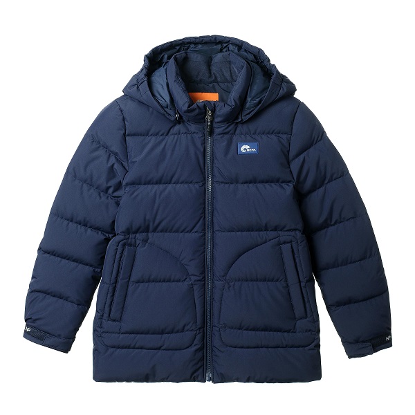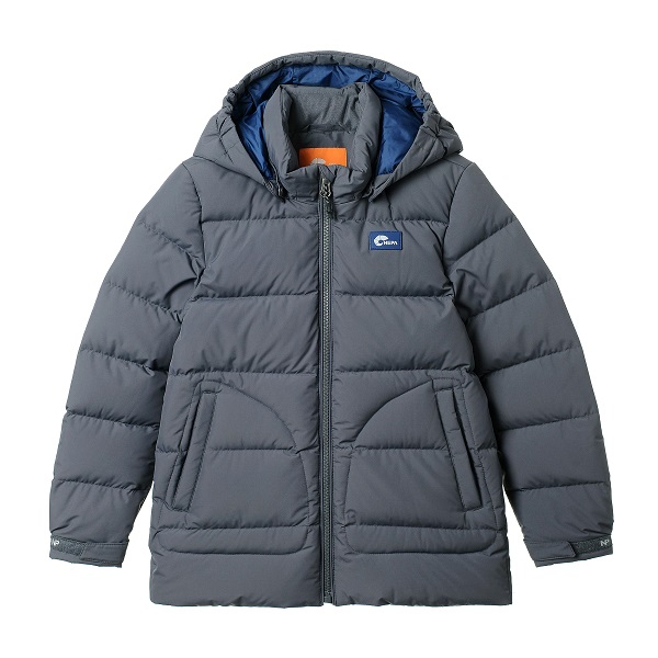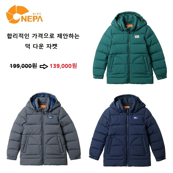 합리적인 가격으로 제안하는 덕 다운 자켓 베이직한 디자인에 핸드 포켓 디자인형태와 로고컬러와펜으로 포인트를 준 아이템 코디 용이하고 네파키즈의 베스트 셀링 컬러로 제안하는 아이템 소매부분에 벨크로 처리로 사이즈 조절 및 활동성 높임 키즈의 안정성 고려하여 부드러운 타입의 벨크로 사용함