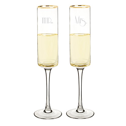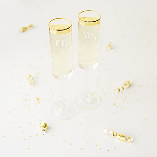 Studio : Cathy's Concepts Publisher : Cathy's Concepts Binding : Kitchen Product Description Inspired by the Roaring twenties, the Mr. Mrs. Gatsby gold rim contemporary champagne flutes are tailored with art Deco typography. Featuring a cylinder-shaped bell, modern stem, and a gold rim, this flute set is perfect for any occasion. These beautiful gold-rimmed couple's flutes are perfect for weddings, anniversaries, or as a gift for newlyweds. 0