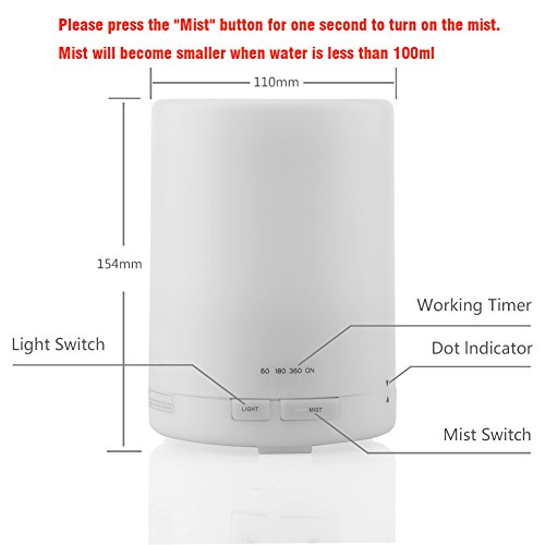 Notes: Please add water below the Max line(mist will become smaller when water is less than 100ml). Please press the "Mist" button for one second to turn on the mist. Please clean it once a week. Description: Mist Control