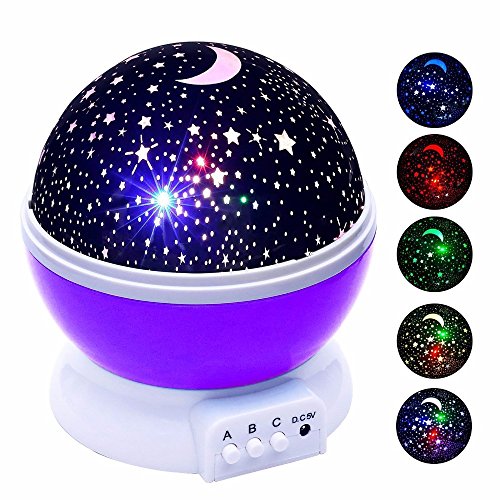 -. Feature : THREE MODES - 3 buttons located on the front which labeled, A Mode: The night light (warm light); B Mode: cycles through color options. C Mode: It is to the rotary switch (rotate or do not rotate freely selectable) control.Star and moon projector lamp with 4 LED beads of warm light, blue light, green light, red light. / INDOOR DECOR -- For wedding, birthday party, and festival celebration or any occasion you want as a decorative night light, creating a special and romantic atmosphere in your bedroom or other indoor use. It's a great Christmas and birthday gift for your friends or family, especially for girls and kids. / STAR PROJECTOR -- The stars were cast on the ceiling when the light on, showing an unforgettable night you can share with you family or friends. With removable white dome, you can operate it as a night light or projection show of the moon and stars. / MORE BRIGHTER: The higher power bulbs which could be more brighter and more beautiful. 4*AAA batteries could support the lamp working, or use the USB cable connect to the power supply. / PROMOTE SLEEP -- Get closer to the moon and stars, quiet and smart, and give your child a good night's rest with this night light for kid's room. What is more, it can help parents coax the baby to sweet sleep.
