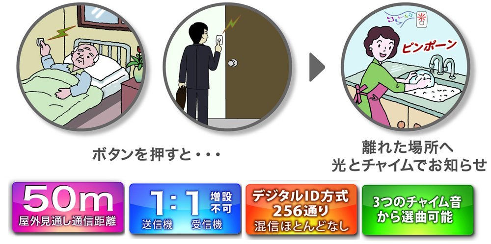 You can use it by choosing from the chime sound (for ping-pong / ping-pong pong / Elise) ● This machine has 1: 1 dedicated ID so you can not add a transmitter or receiver [