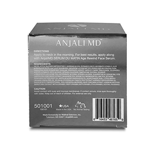 Age Rewind Neck Cream tightens and lifts your neck and reduces sagging. ANJALI MD Crème Matin Age Rewind Neck Cream is a rich concentrated cream designed to tighten and lift your aging, crepey neck and décolletage. The science behind our neck cream works to get you a more youthful appearance: Transformative peptides stimulate collagen for a stronger, smoother, refined silhouette. Stress, wrinkles and fine lines relax as powerful SNAP-8 decreases neurotransmission at the cellular level. Essential Sea Mineral Complex and Marine DNA/RNA perform in a powerful synergy with nano-encapsulated CoEnzyme Q10 to channel energy, peptides and elegant nutrients deep within, revitalizing molecular repair. Red Wine and Resveratrol antioxidants protect your neck. Advanced Nano-Encapsulation Double-Layer Liposome Technology (NEDLL) ensures continuous, time-released delivery of nutrients throughout the day. Your neck contour is rejuvenated and your youthfulness is renewed with a new lifted, sculpted definition.Feature