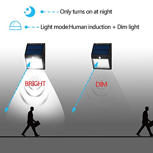 2 modes: Auto on at night, off at sunrise; dim light when no motion, bright light when into 5meter detective zone. Much energy saving.