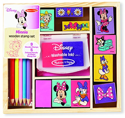 This sturdy wood-and-rubber set has everything kids need to stamp and color pictures of Minnie, Daisy, Bella, Figaro, and lots and lots of bows! Featuring 9 wooden stamps, 5 colored pencils, and a 2-color stamp pad with washable ink, this charming set encourages early learning and hands-on play.