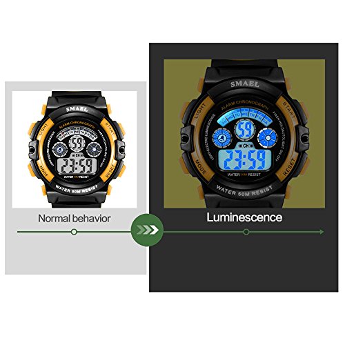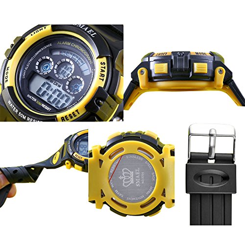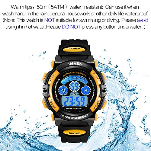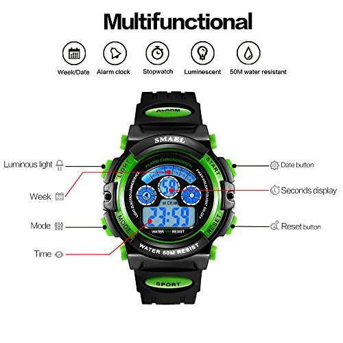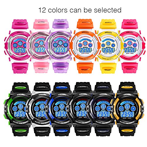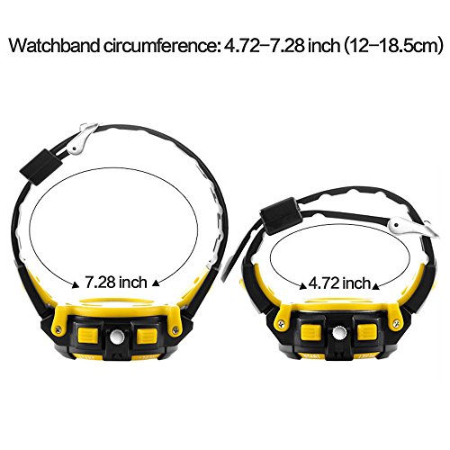 -. Feature : Using electronic movement, stable and powerful. PU resin watchband design is more ergonomic, abrasion resistance and prevent allergy, it is very comfortable to wear, make kids play or exercise without restraint. / Are you worried that your child can't read the pointer watch? This is a digital display watch, it's especially convenient for kids to understand the time. Multifunctional modes: Time, stopwatch, alarm clock, date, many modes can be switched at will, it can meet the older children more demand for watches. / Luminescent mode: Can't see the watch time in the dark? One button switching to luminescent mode, let your children can see the time clearly in the dark. It must be very cool for them. / 50m(5 ATM) water-resistant: Can use it when wash hand, wash car, in the rain, general housework or other daily life waterproof. (Note: This watch is NOT suitable for swimming or diving. Please AVOID using it in hot water. Please DO NOT press any button underwater.) / Watchband circumference: 4.72-7.28 inch (12-18.5 cm), freely to adjust it to fit kids size. It is suitable for all occasions. Exquisite black packaging tin box, an English manual, it is a perfect gift for your kids.