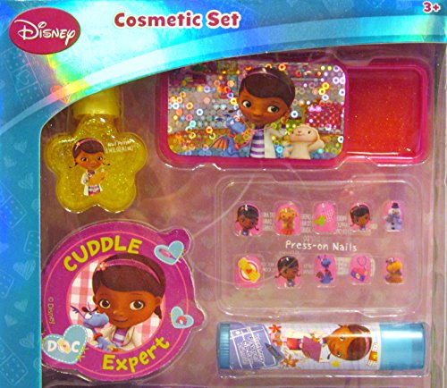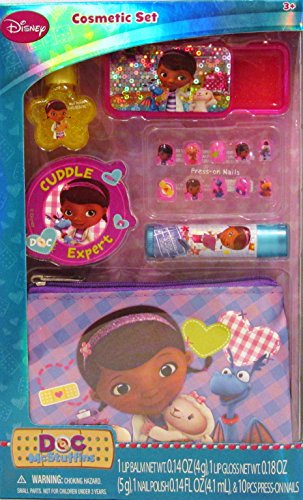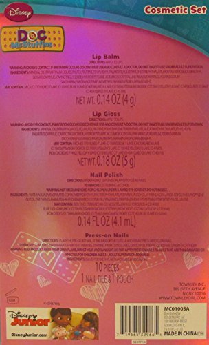 - Feature : Bundle includes 2 Items: A Doc McStuffins Cosmetic Set and a Small Reusable Tote for 3+ Years Girls / Adult supervision required. / Included are a Lip Balm, Lip Gloss, Nail Polish, and a 10-Piece Press-On Nails set with Nail File and Pouch. / Caution: small parts can cause choking hazard. / Pretend Play for your little ones