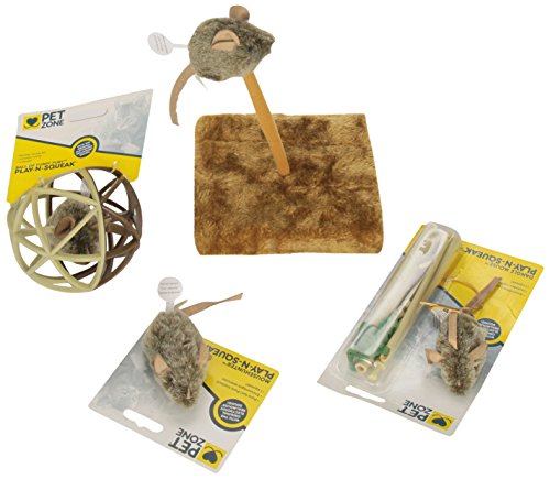 -. Binding : Misc. -. Brand : Pet Zone -. EAN : 0780824129162 -. Feature : Mouse hunter No.1 cat toy - with Real Mouse sound. It's fury, it squeaks and cats love to chase it! / Dangle mouse wand assemble in seconds, cat's love stalking and pouncingball of furry fury - cat's can bat, chase or reach in to paw the mouse inside / SP.R.Ing fling provides mental stimulation and exercise. Loads of fun! -. Label : Our Pets -. Manufacturer : Our Pets -. Model : 1550012916 -. MPN : 1550012916 -. PackageQuantity : 1 -. PartNumber : 1550012916 -. ProductGroup : Pet Products -. ProductTypeName : PET_SUPPLIES -. Publisher : Our Pets -. Studio : Our Pets -. Title : Pet Zone Favorite Play N Squeak Cat Toys, 4-Pack -. UPC : 780824129162