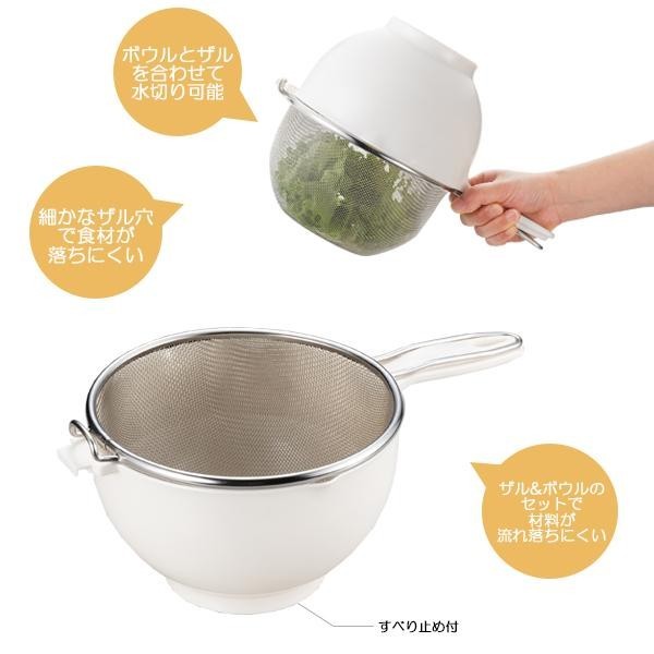 | 両側に注ぎ口が付いた片手ボウルとステンレスザルのセット。ザルを逆さにセットすると簡単に水切りができます。 |