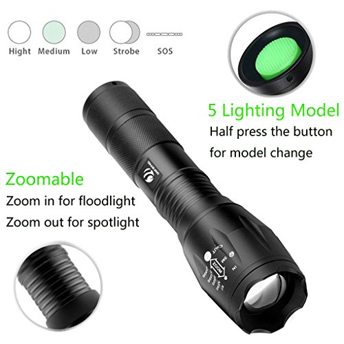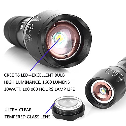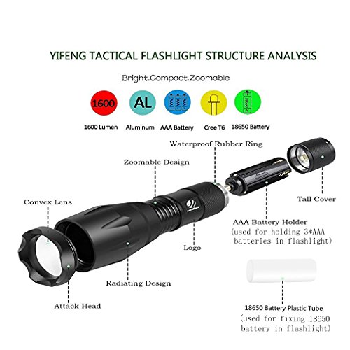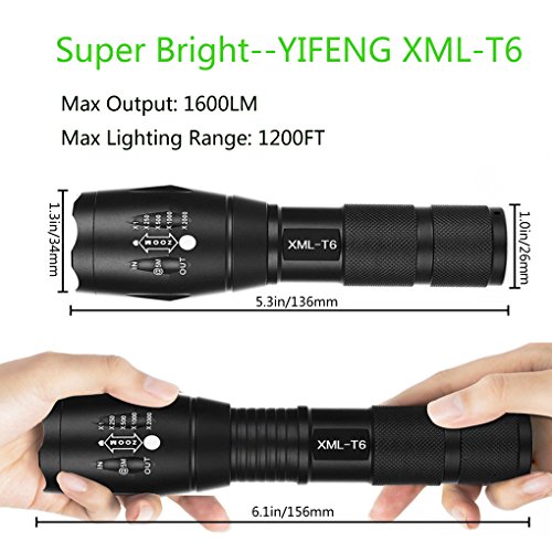 YIFENG XML-T6 Portable 1600 Lumen CREE LED Tactical Flashlight with 5 Light Modes and Zoom Function, 2 pack
