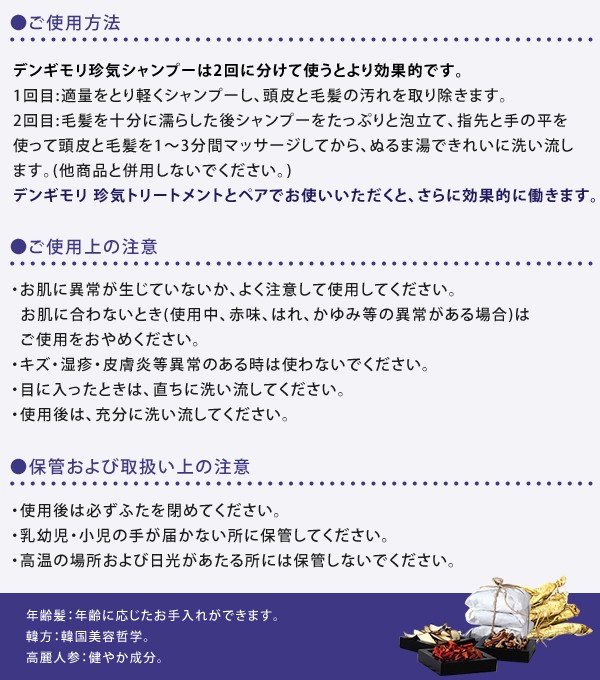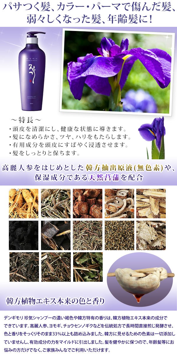 | 東洋人の頭皮と髪に最も合う韓方植物成分を濃縮配合しています。「髪がまとまりにくい」、「髪のハリ、コシがなくなった」、「髪のツヤがなくなった」…などの気になる方にオススメです。精製水ではなく、韓国で昔から頭皮と髪のケアに使用されてきた、天然保湿成分の多い菖蒲水を使用しています。 |