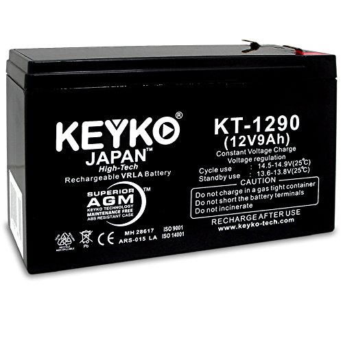 Studio : Keyko Technologies LLC Publisher : Keyko Technologies LLC Binding : Electronics Product Description KEYKO ® replacement batteries meet and even exceed Device's manufacturers specification needs, to ensure its High Standard Japanese quality, long lasting working life 3-5 Floating time range, high ABS material resistant, with own technology grid design and paste formulation, AGM ™ high standard separators, and all this together, giving to each battery the best technology and performance. Featuring high discharge design, wide operating temperature range, and long expected service life. KEYKO ® KT-1290 12Volts 9 Amp replacement battery feature Valve-Regulated Lead Acid (VRLA) SLA Sealed Lead Acid Battery Technology, making them safe to operate in any position, near people and sensitive equipment. Manufactured under Japanese Quality standard, Environment Certificated Plant and facilities with ISO 9001 for Quality Management Systems, ISO 14001 Environment Management System (EMS), also with Health and 14001 Safety Environment Standards certification, and under UL (Underwriters Laboratories) certifying Quality and manufacturing processes. Must install new KT-1290 in your unit using the same original configurations and existing cables and connectors. Please check your battery for dimensions and Terminals prior to ordering as manufacturers may change requirements without notice. 0