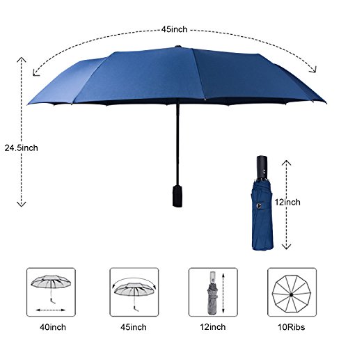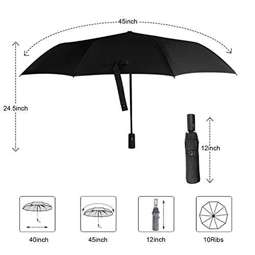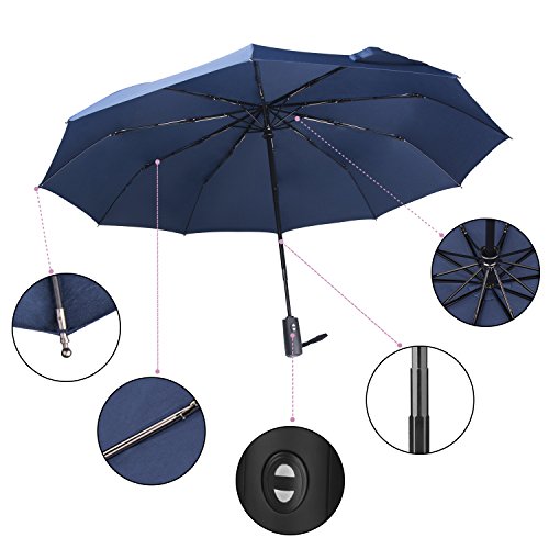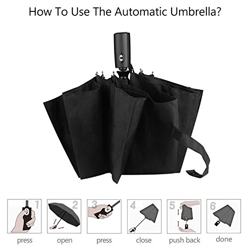 -. Feature : 【10-RIB DESIGN 】Compared to common 6-rib umbrellas, this umbrella has 10 fiberglass ribs, making it SUPERIOR WINDPROOF to endure 60MPH wind. / 【AUTOMATIC OPEN/CLOSE】 You can quickly open and close the canopy by pressing a button. When you get caught in an unexpected downpour, you won't get wet by opening or closing the umbrella in less than a second. / 【WATERPROOF AND INSTANT DRYING】 Fabric is made of high density polyester 210T pongee, which makes the umbrella water repellent and QUICK TO DRY. / 【IDEAL GIFT 】This umbrella is fashionable and an ideal gift to family and friends. We provide a perfect gift box with every umbrella free for you to pack your present. / 【WARRANTY 】Our LIFETIME GUARANTEE ensures that we offer a full refund for the first 90 days if the product doesn't meet your expectations and a replacement warranty for the lifetime of your purchase.