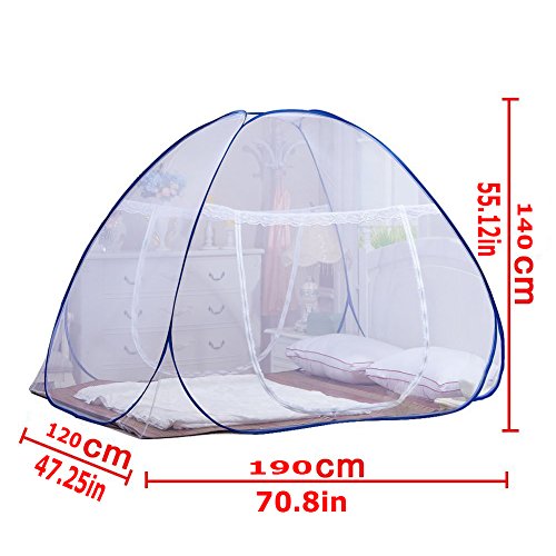 This mosquito net is suitable for 190cm(Length)*120cm(Width)/ 74.8inch(Length)* 47.25inch(Width) bed or bigger bed The actual color might be different due to the lighting Bed Dimension(May not fit for your bed dimension, accurate bed dimension please contact bed seller) Size: 190cm(Length)*120cm(Width)*140cm(Height) Material: Stainless steel wire, polyester fiber Features: 1. One touch design, easy to set up 2. Dense small mesh holes, effectively isolate mosquito 3. Double 80cm door with 2-ways zipper 4. Foldable design, convenient storage and carrying 5. With bottom design to prevent baby fall from bed Application: Home living /outdoor products Package includes: 1x Mosquito Net