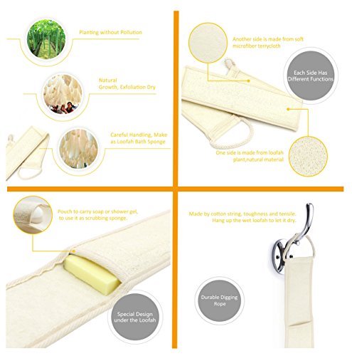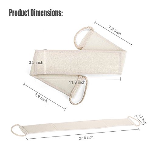 Large Size: Full size 3.3" x 27.6" with reinforced handles and bar soap pouch. Made from Natural Organic Luffa.