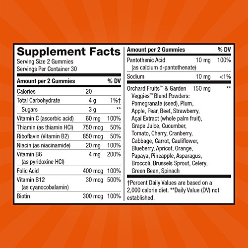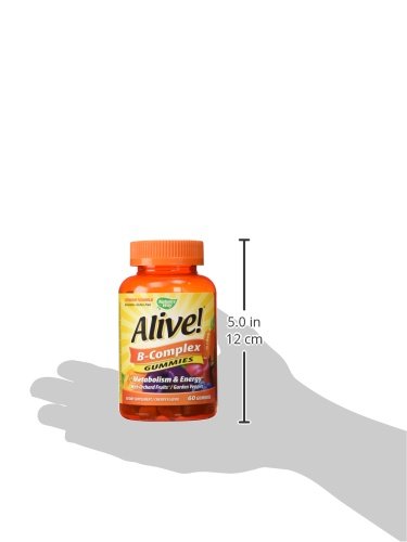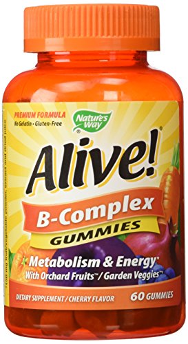 Alive b-complex 60 gummiesdaily energy gummy with full b-vitamin complexsupports daily metabolism to help convert food into energyorchard fruits and garden veggies blendprovides 150 mg fruit/vegetable powder, extract and dried juice per servinggreat tasting pectin-based gummies (no gelatin)sweetened with organic tapioca and dried cane syrups. Delicious cherry fruit flavor, gluten-free- fulll b-vitamin complex- daily metabolism support to help convert food into energy- pectin gummies sweetened with tapioca and dried cane syrupsuggested use as a dietary supplement adults and children 12 years of age and older, chew 2 gummies daily. - Or as directed by your healthcare professional.Supplement factsserving size: 2 gummiesamount per serving% daily value***calories15*total carbohydrates4g2%sugars3g*vitamin c (ascorbic acid)60 mg100%thiamin (as thiamin hci)750 mcg50%riboflavin (vitamin b-2)850 mcg50%niacin (as nicotinamide)20 mg100%vitamin b-6 (as pyridoxine hci)4 mg200%vitamin b12 (as cyanocobalamin)30 mcg500%biotin300 mcg100%pantothenic acid (as calcium d-pantothenate)10 mg100%sodium10 mg**daily value not established***percent daily values are based on a 2,000 calorie dietother ingredients: Dried cane syrup, organic tapioca syrup, pectin, citric acid, sodium citrate, natural cherry flavor with other natural flavors, black carrot color, fractionated coconut oil (non-hydrogenated), beeswaxdoes not contain: Gluten free. No yeast, wheat, dairy, eggs, peanuts, artificial flavors or preservatives.Warnings: Keep out of reach of children. As with all dietary supplements, consult your healthcare professional before use. See product label for more information. Safety sealed for your protection. Do not use if safety seal under child resistant bottle cap is broken or missing. Store at room temperature. Keep bottle tightly closed. Avoi.Feature