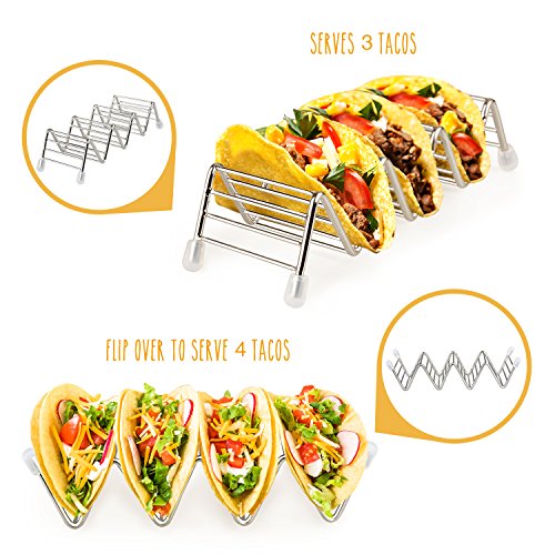 Studio : Orblue Publisher : Orblue Product Description The Orblue 3 pack Taco Stand Set are well crafted with 202 stainless steel wire framing preventing rust and keeping a glossy finish for years to come. This wonderful kitchen tool makes preparing your soft or hard-shell tacos easy but holding the shells in an upright position for easy stacking of your favorite toppings. Present 9 tacos to your friends or family while looking great or simply flip over and have space for 12. See images above. Each stand has 4 plastic protectors to prevent sliding across the table or scratching your surface tops. Dishwasher safe. 0