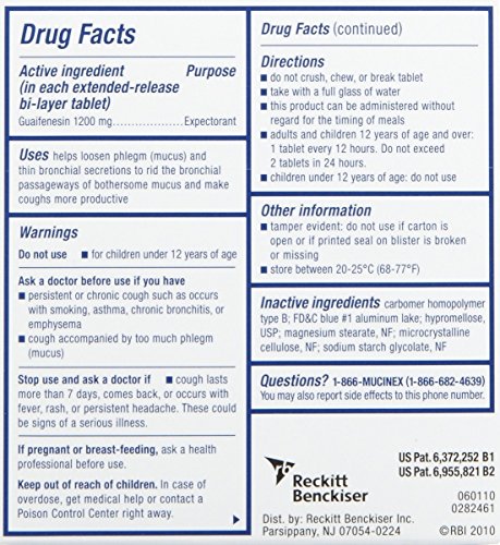 Whenever you are congested, MucinexMaximum Strength Expectorant can help you get rid of excess mucus by making your coughs more productive. Mucinex is the only FDA-approved, 12 hour, extended-release guaifenesin that provides relief from chest congestion in 1 convenient bi-layer tablet. Uses - Helps loosen phlegm (mucus) and thin bronchial secretions to rid the bronchail passageways of bothersome mucus and make coughs more productive. Active Ingredient - Guaifenesin 1200 mg... Expectorant (in each extended-release bi-layer tablet) 0 |