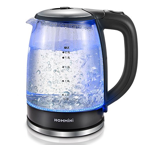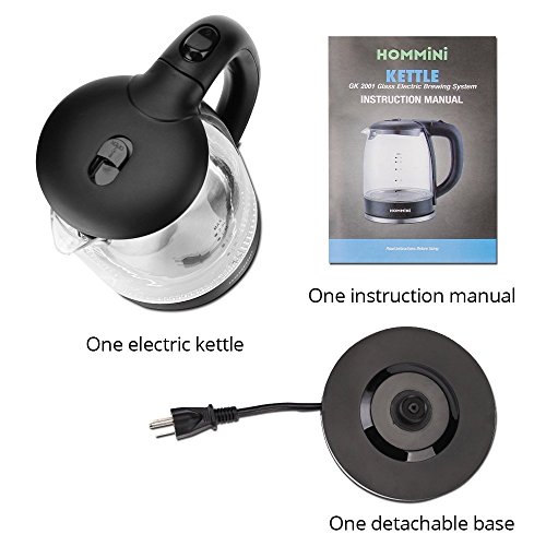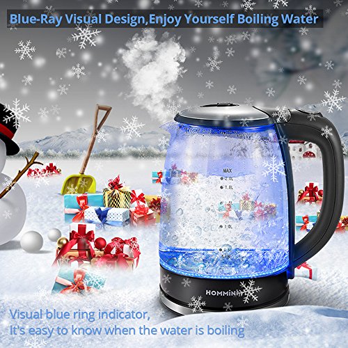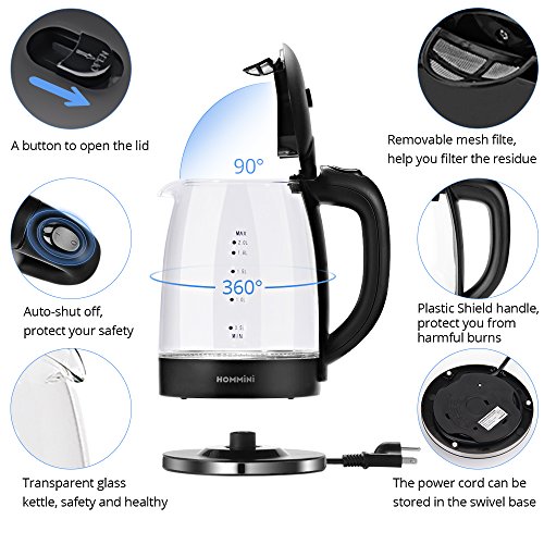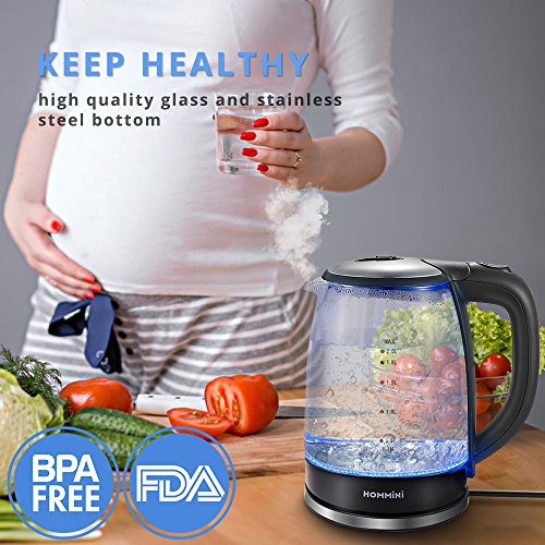KEEP HEALTHY :HOMMINI Electric Transparent Glass Kettle made of high quality glass and stainless steel bottom, Anti-scald inner and outer double protective design,no smell,also safety and healthy for baby