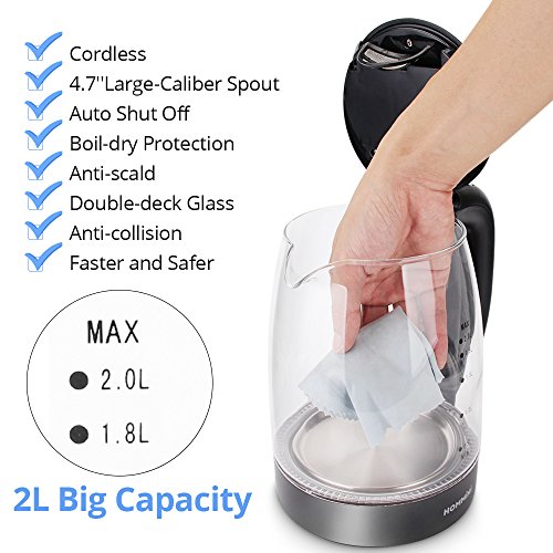 2.0L & QUICK HEATING:With 2.0 Liter large capacity,the water comes to a full boil within 10 minutes, Faster than a microwave and safer than a stovetop, Large capacity for water inputting to meet the needs of whole family's drinking ,without frequently boiling water