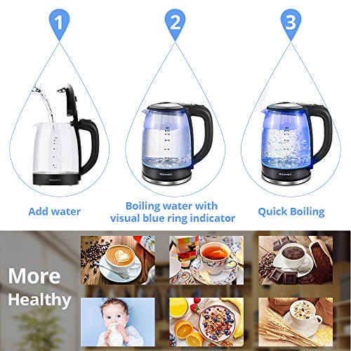 BLUE-RAY VISUAL DESIGN:Visual blue ring indicator,It's easy to know when the water is boiling.Visible LED heating lamp looks nice and warm at night,enjoy yourself boiling water