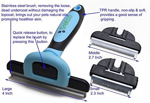 GreEco 3-in-1 DeShedding tool includes 3 different sizes brushes (Small 2.3 inches, Middle 2.7 inches & Large 4 inches), it is designed for all shedding pets -- small to large, short to long haired cats and dogs. If necessary it is so easy to replace the brush by pressing the QUICK RELEASE button.