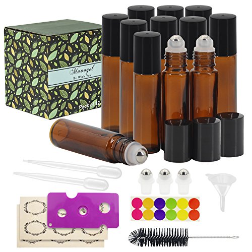 Glass Roller Bottles - 10ml, 12 Pack, Amber by Mavogel, Stainless Steel Roller Balls, Essential Oil Opener, Bottle Brush, Droppers, Funnel, and Labels Included