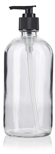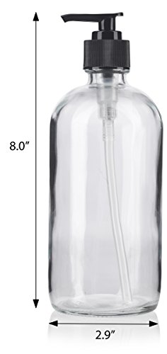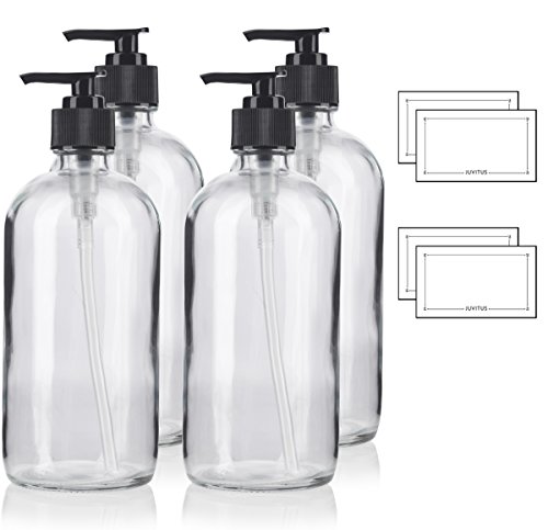 16 oz Clear Boston Round Thick Plated Glass Bottle with Black Lotion Pump (4 Pack) + Labels - Perfect for Home, Cleaning, Cooking, Essential Oils, DIY, Gifts