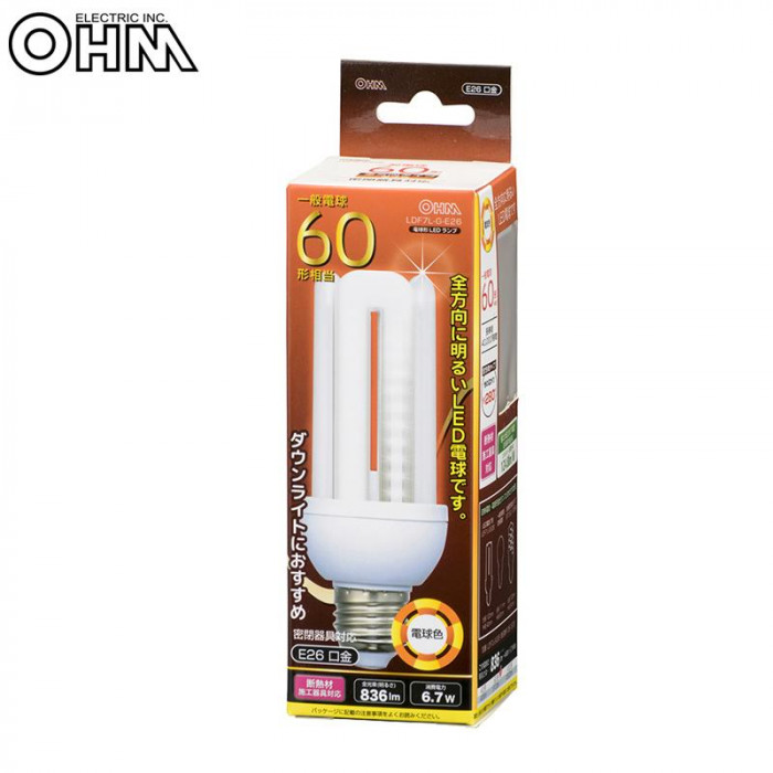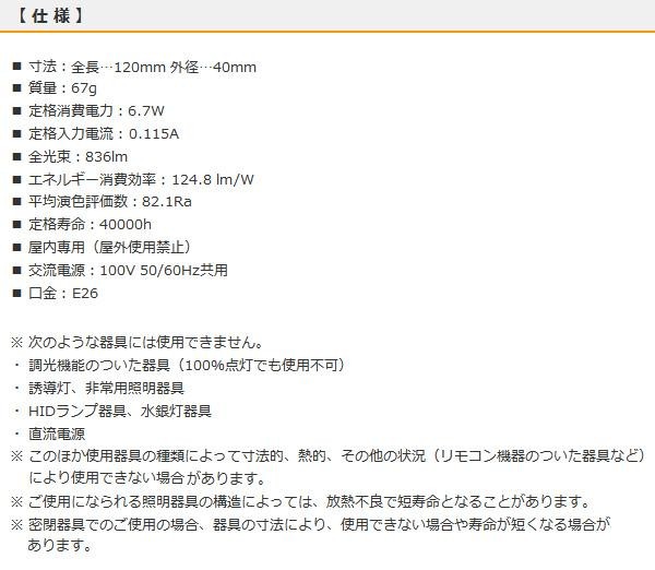 一般電球60形相当の明るさ。密閉器具、断熱材施工器具にも対応します。光色は電球色で屋内専用です。