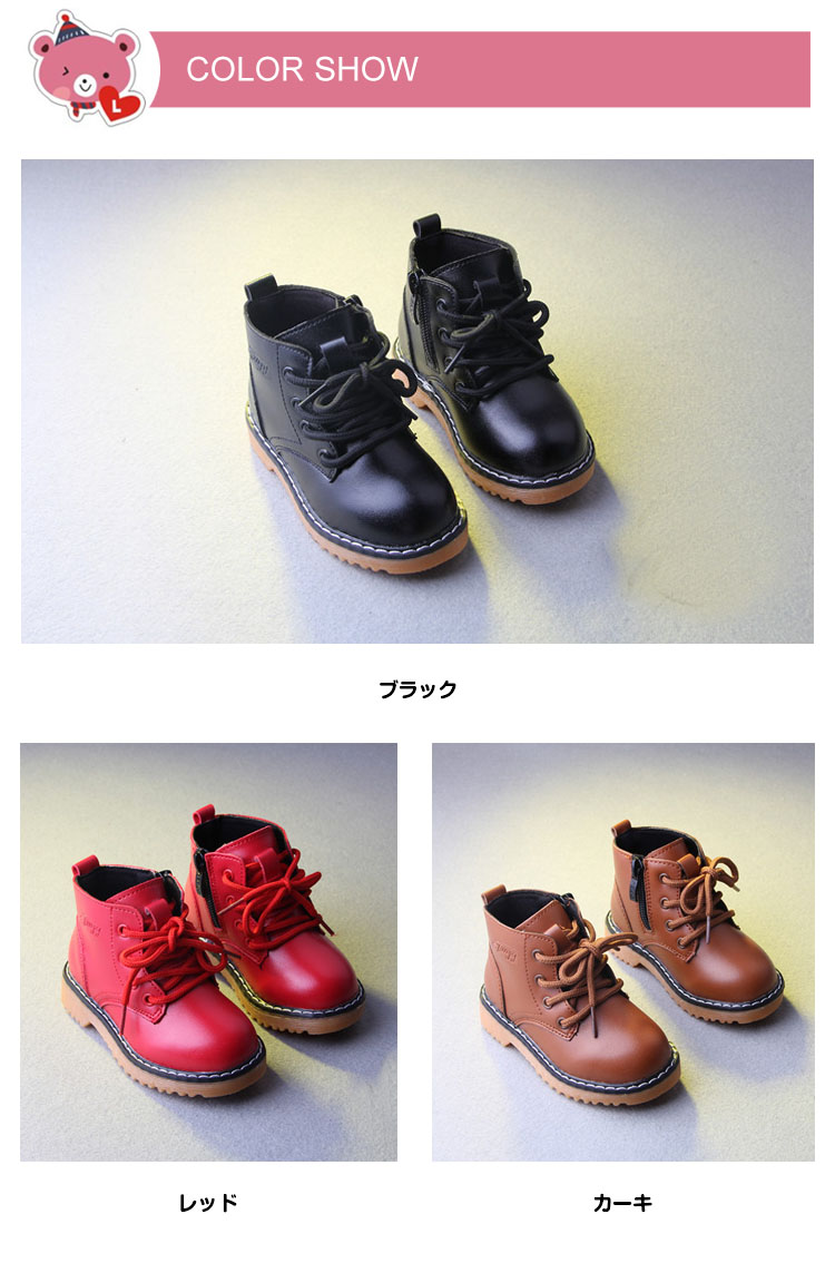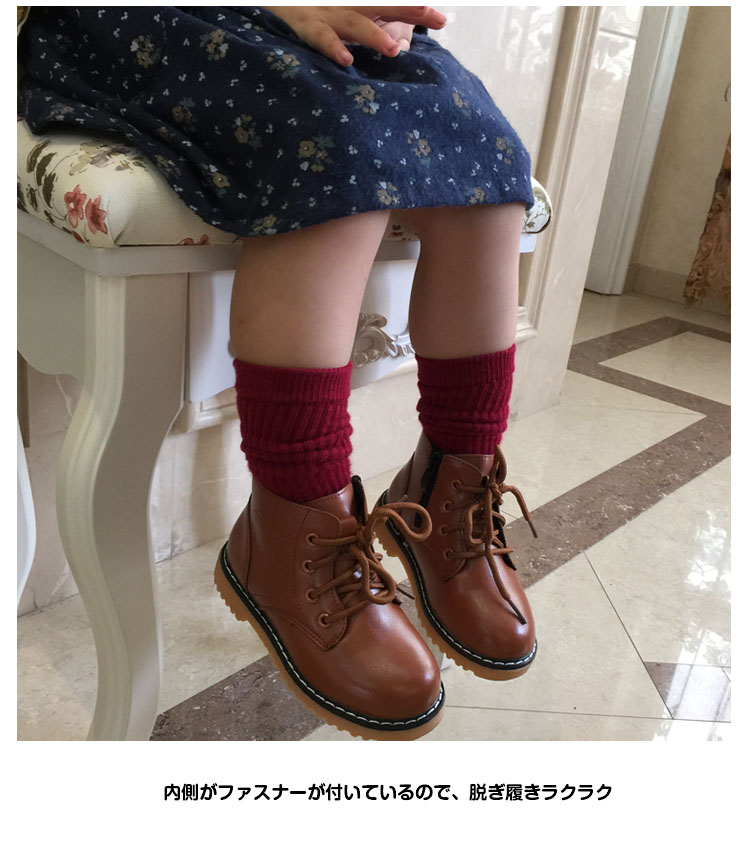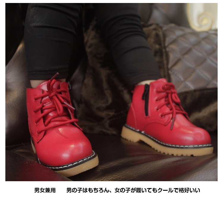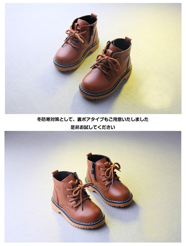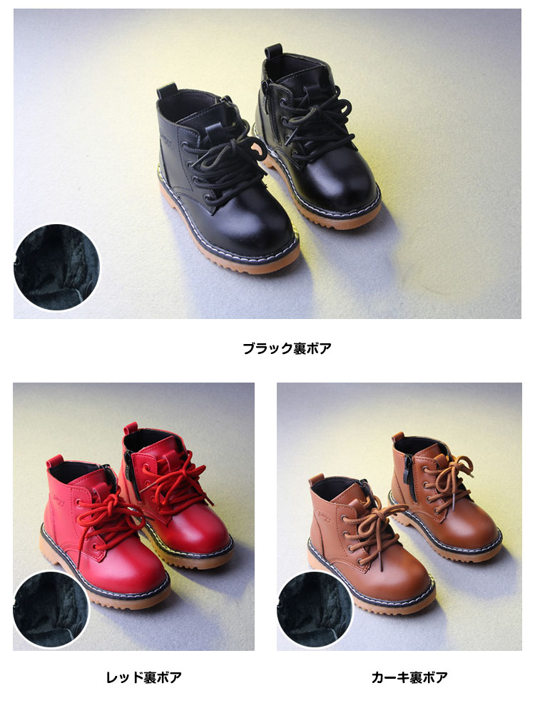 | シンプルで格好いいマーチンタイプのお洒落なレースアップブーツ艶感のある上品なレザーを使用し、光加減によって表情が変わります男女兼用 男の子はもちろん、女の子が履いてもクールで格好いい内側がファスナーが付いているので、脱ぎ履きラクラク滑り止め加工を施したアウトソールは安全性が高くしなやかな柔軟性でしっかり歩行をサポート冬防寒対策として、裏ボアタイプもご用意いたしました是非お試してください | |