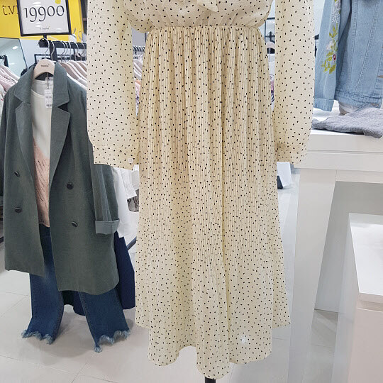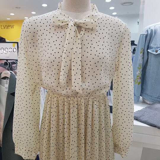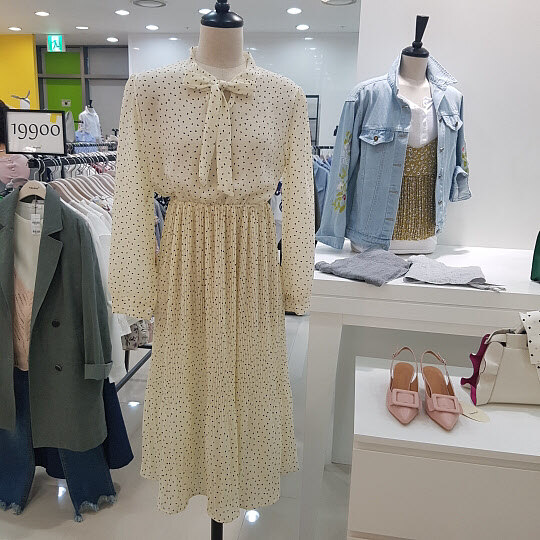가슴아래쪽 밴딩으로 날씬해보이는효과가있어요잔잔한도트가 여성스러운 원피스입니다