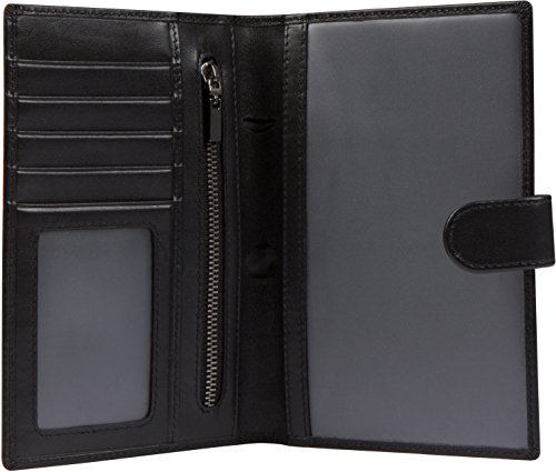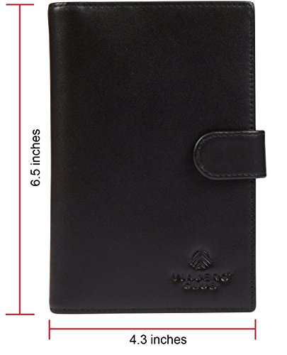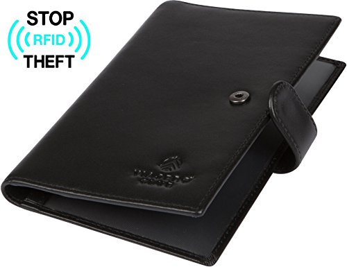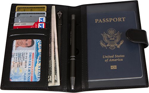 -. Feature : 100 % GENUINE LEATHER: Made with premium high quality leather for a classy look. It has a smooth, soft and luxurious feel in your hands. / HIGHLY FUNCTIONAL: Carry all your travel essentials in one place. 1 slot for passports, 5 slots for credit card and IDs, 1 large pocket and 1 secure zipper compartment for cash, boarding passes and tickets. Built-in pen-holder for convenience and button strap to keep the holder securely closed. / SLIM & STYLISH: Sleek jet-black color and design is perfect for business, family and international travellers alike. Fits perfectly into an inner coat or jacket pocket for easy access and carry. / RFID BLOCKING PROTECTION: Lined with RFID blocking material on the inside of the stitching. Designed and lab tested to block frequency 10 MHz to 3000 MHz, including the 13.56 MHz frequency to prevent your credit card, debit card and passport chip information from being stolen by RFID scanners. Fully protects your privacy and keeps personal information safe. / PERFECT HOLIDAY GIFT - Packaged in a beautifully embossed gift box. The perfect present for anniversaries, birthdays or the traveler in your life.