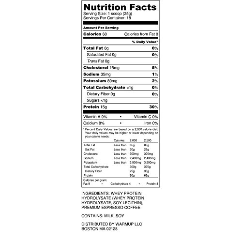 -. Binding : Health and Beauty -. Brand : WarmUp -. EAN : 0008695290003 -. Feature : INCREASE ENERGY AND BUILD LEAN MUSCLE - This premium coffee protein powder will get you up and energized with over a double shot of espresso (223mg natural caffeine per serving), while getting the protein you need in your day with 15 grams of it! / ALL NATURAL QUALITY - Don't worry about ingesting harmful fillers, sweeteners, or flavors. WarmUp protein coffee only contains the necessary ingredients to get you going and your muscles growing! When we say "all-natural", we really mean it! / LACTOSE FREE AND NO SUGARS OR CARBS - The protein in our blend comes from Whey Protein Hydrolysate (THE HIGHEST QUALITY PROTEIN AVAILABLE). Don't believe us? Look it up! This makes it so you get your daily value of protein without the bad news of added sugars, carbohydrates, and lactose. It also is digested and absorbed by the body faster than other forms of whey. WarmUp can easily incorporate into your sugar free or keto diet as well. / ONLY 3 INGREDIENTS - At WarmUp we don't find the need to fill our products with ingredients that are unnecessary. So we made it a point to only include truly nutritious and best tasting ingredients. / ON THE GO MEAL REPLACEMENT - Nowadays our lives are getting busier and busier and that makes eating a meal harder and harder. That's why ambitious, hard working, and on the go people enjoy our product so much. Whether you need a quick pick me up at the office, are that on-the-go mom, or an athlete looking for energy before a workout, WarmUp is there for you and can suit your needs! -. IsAdultProduct : 0 -. Label : WarmUp LLC -. LegalDisclaimer : These statements have not yet been evaluated by the United States Food and Drug Administration. This product is not intended to diagnose, treat, cure or prevent any disease. -. Manufacturer : WarmUp LLC -. MPN : 1 -. PackageQuantity : 18 -. PartNumber : 1 -. ProductGroup : Health and Beauty -. ProductTypeName : HEALTH_PERSONAL_CARE -. Publisher : WarmUp LLC -. Studio : WarmUp LLC -. Title : WarmUp Protein Coffee Powder | All-Natural, High Quality Whey Hydrolysate with Over a Double Shot of Espresso Caffeine | Served Hot/Iced -. UPC : 008695290003