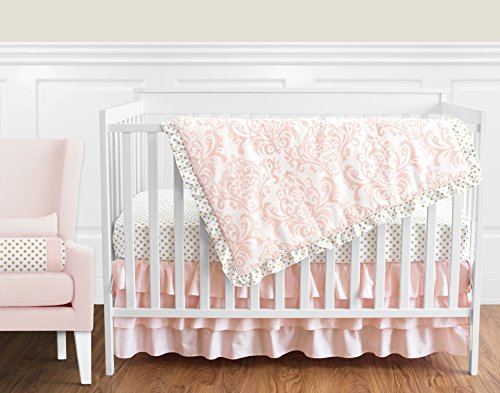 -. Feature : 4 Piece Set Includes: (1)Crib Blanket, (1)Fitted Sheet, (1)Crib Skirt and (1)Diaper Stacker / Crib Blanket: 45in. x 36in. Fitted crib sheet: 52in. x 28in. x 8in. pocket Crib Skirt: 52in. x 28in. x 15in. drop Diaper stacker: 15in. x 6in. x 20in. **Sweet Jojo Designs also offers matching bumper sold separately and a 9 piece set that includes the bumper / This set combines a delicate blush pink and white damask, a coordinating metallic gold polka dot, and solid blush pink and white cotton / This set is made of 100% cotton and is machine washable. / This design has matching accessories such as window treatments, hampers, shower curtains, memory photo boards, body pillow cases and decorative pillows.