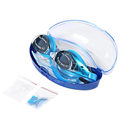 -. Feature : - Adjustable double head strap and two replaceable nose bridges, you can adjust it as you need, and with two free ear plugs, make you have a better swimming experience / - High-grade polycarbonate lens are tinted and mirrored to reduce glare, no more squinting, coated for anti-fog and UV protection, have a clearer vision under water / - With ultra wide angle lens, much wider vision, you need no more turn your head when swimming / - No more pain in your eye sockets because it is designed for comfort and made with soft silicone