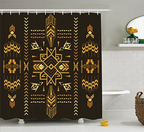 Geometric Shower Curtain by Ambesonne, Tribal Hand Drawn Vintage Aztec Background in Vector Illustration, Fabric Bathroom Decor Set with Hooks, 75 Inches Long, Dark Brown and Mustard