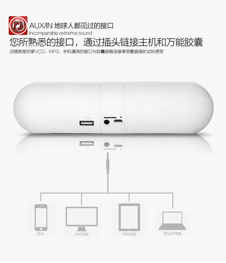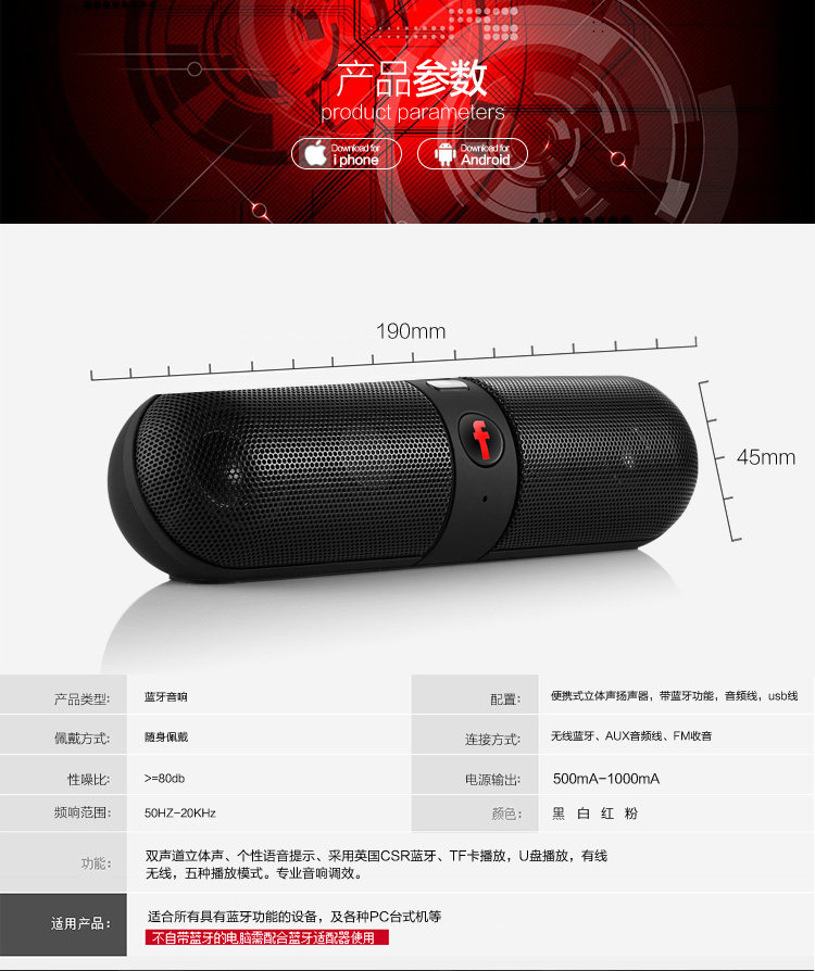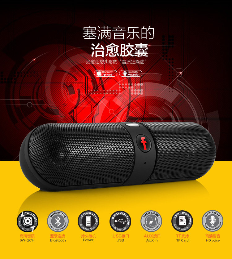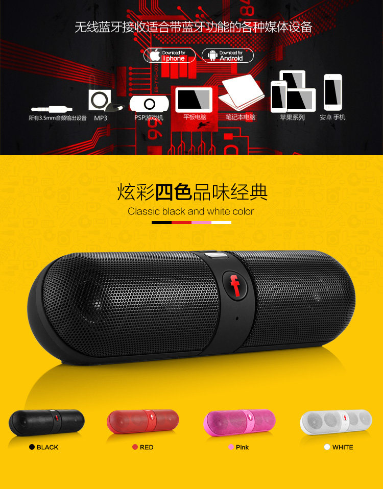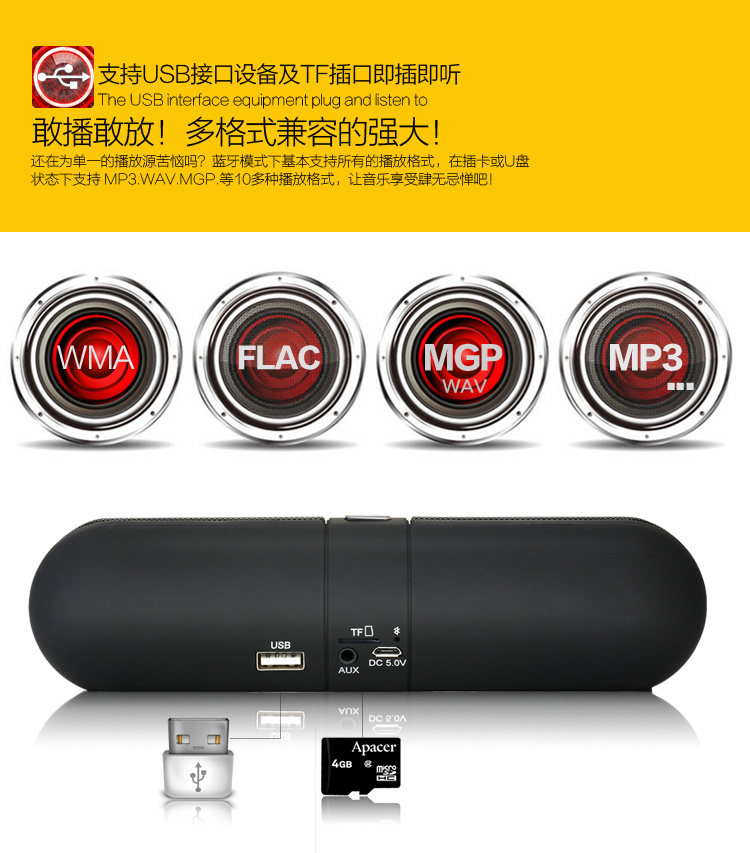 Highly dependable Bluetooth design to receive and play audio files from iPad, iTouch, iPhone, cell phones, MID and PCs Equipped with AUX interface Automatically identifies and plays music in MP3 format from a TF card or USB flash drive microphone