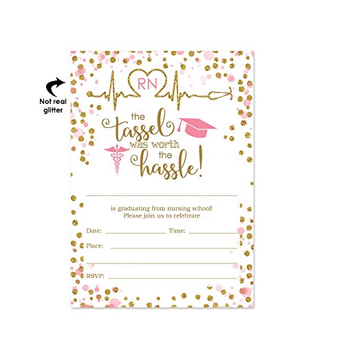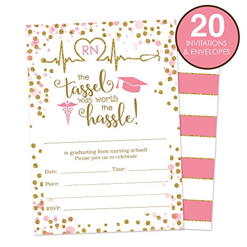 Nursing School Graduation Invitations 20 Ct. Includes White Envelopes - Pink and Gold - RN Graduation Invitations - Medical Graduation