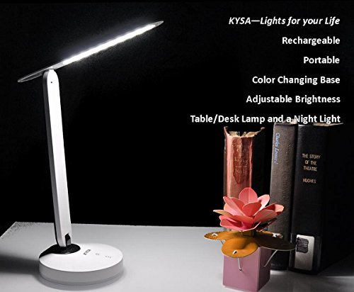 -. Feature : PORTABLE, RECHARGEABLE WITH POWER ADAPTER: Because of built-in Li-battery, you can carry it anywhere for camping or reading outside in the evening during the summer and great for emergency lighting. / EYE-CARING AND COLLEGE STUDENT DESK LAMP: Color temperature (5300K-5600K), there is no glare or no harsh light. It is right for the college students and other young students. / FOLDABLE FUNCTION - 180°adjustable head & 160°arm, set the shade to provide the best lighting for your environment. / COLOR CHANGING BASE: This lamp will change automatically the color of the base ring. Make your reading more interesting. / EYE-FRIENDLY: The light source of desk lamp is non-flicking LEDS. The LEDs emits even, flicker-free and non-glare light, which is soft on your eyes and avoids eye fatigue caused by flickering light and harsh glare effectively.